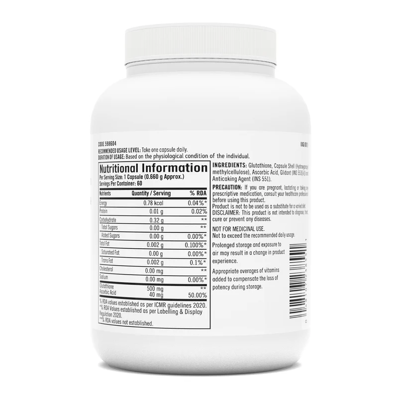 “Experience beautiful skin and better immunity everyday with the GNC Glutathione 500mg capsules. Formulated with knowledge and care, this supplement contains Glutathione in its reduced & active form L-Glutathione to deliver the intended results with amazing efficiency. It also includes a crucial supporting ingredient Vitamin C that intensifies the benefits. Vitamin C not only improves the Glutathione absorption but also further augments Glutathione’s advantages in providing antioxidant protection, skin brightening, and other advantages. One of the major shifts you’ll experience with the GNC Glutathione is significant reduction in dark spots and visible brightening of your skin. This Glutathione helps minimise melanin production and fades out pigmentation marks to give you a luminescent & even-toned skin. Vitamin C in the formula helps reduce sun-induced skin patches and boost collagen levels for a smoother and radiant appearance. Glutathione and Vitamin C in the formula form a powerful antioxidant pair to eliminate free radicals generated as a detrimental effect of UV rays, pollution, and other daily stressors. They prevent oxidative harm to ensure better immunity and skin health. GNC Glutathione gives your body a thorough detox by completely removing all of the toxins. This detoxification restores the natural balance of all the inner workings of your body. Glutathione and Vitamin C boost your immunity by stimulating healthy production of infection-fighting cells. These cells improve your body’s immune defences to prevent all kinds of bacterial, viral, and other infections.”