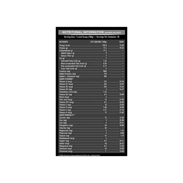 Maltodextrin, Whey Protein Concentrate, Dairy whey powder, Barley malt extract, Cocoa Powder, Calcium Caseinate, Milk Protein Isolate, Medium-chain triglyceride powder, Minerals, Soy Lecithin, L-Glutamine, Stabilizer (INS 415), Digezyme, Vitamins.