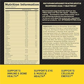 Optimum Nutrition Multivitamin for Men is designed to fill gaps in micronutrient intake, particularly for men with active lifestyle. With 26 Vitamins and Minerals for bone health, immunity, eye health, metabolism, Amino Acids for Muscle Health, and Antioxidants (Green Tea Extract, Beta Carotene, Lutein, Lycopene) to fight free radicals and for immunity.